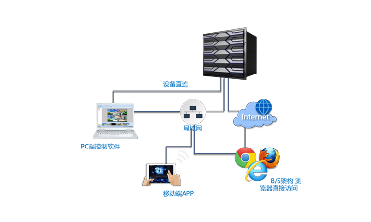 ·用户可通过上位机软件直连或局域网控制,同时设备支持B/S架构,用户可使用浏览器通过局域网或互联网访问设备进行管理 |