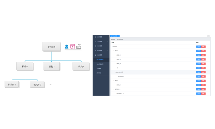组织机构可实现对用户、终端、素材、播放列表等的分层多级管理,选定组织结构下的用户可管理对应机构下的终端。