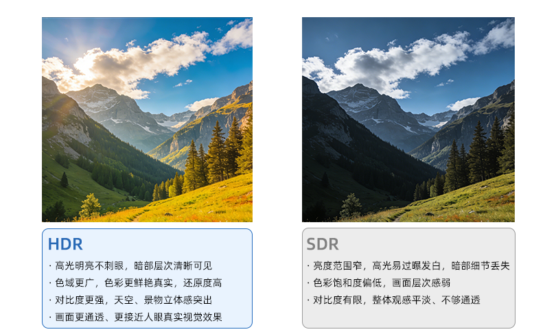 HDR(高动态范围)技术能够呈现更广的亮度和色彩范围,使图像和视频在明暗细节、色彩饱和度和真实感上显著优于传统SDR。
