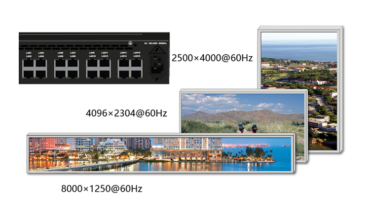 ES16 supports 16 Ethernet port outputs, which resolution is up to 10 million pixels. The maximum horizontal resolution is 8,000 pixels and the maximum vertical resolution is 4,000 pixels.